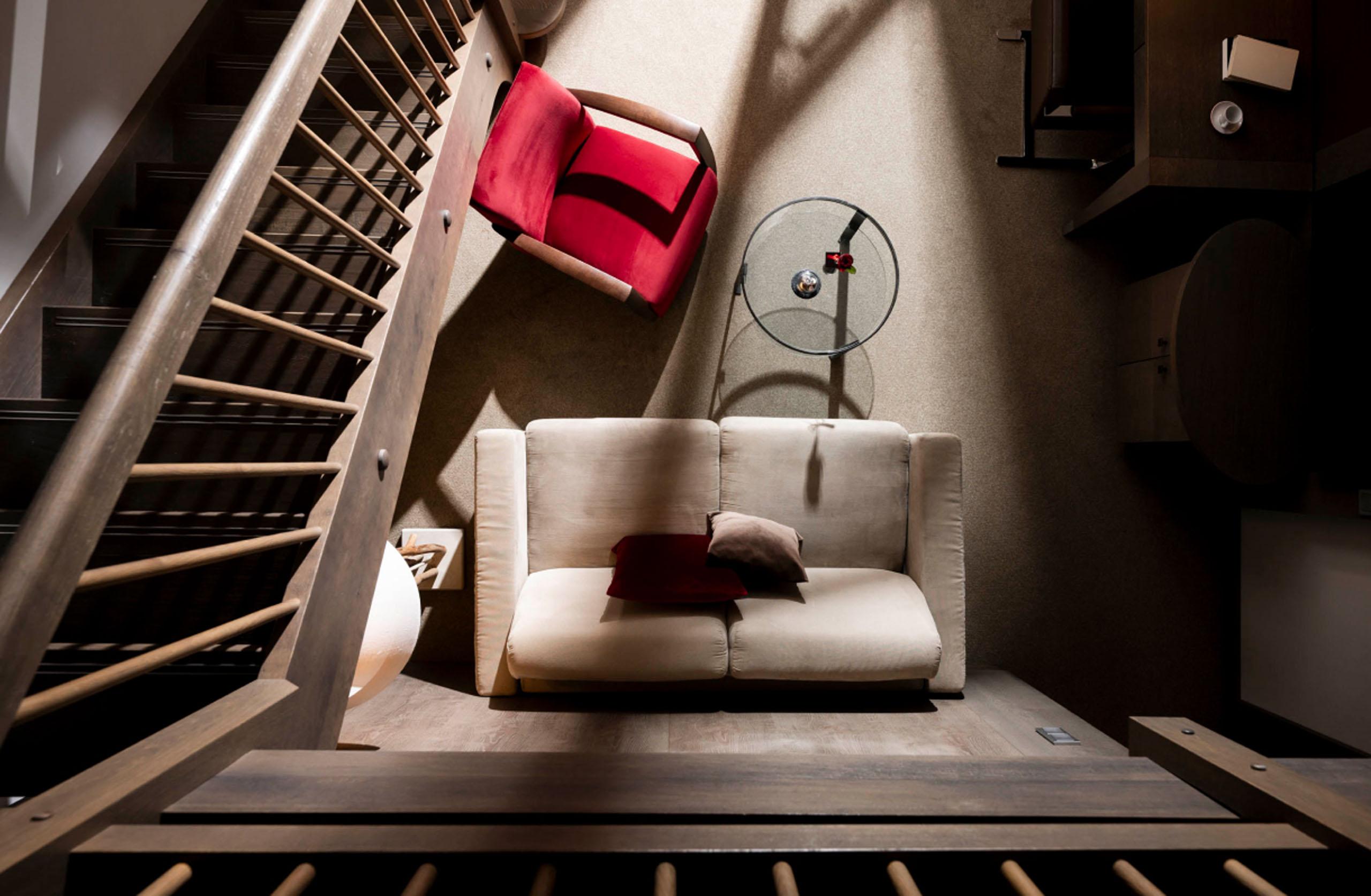 - zwei Etagen: Schlafbereich oben, Sitzecke unten