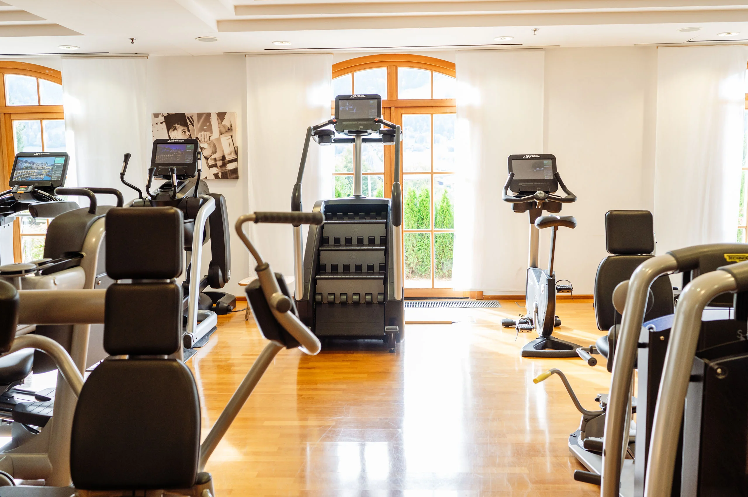 Sie betreten das Schlosshotel Gym. Warmes Licht auf geöltem Holzboden, klare Linien, viel Platz. Die Geräte: modern, bereit für alles zwischen Fokus und Flow. Farbstimmung: dezent. Geräuschkulisse: motivierend ruhig. Hier darf Ihr Training genauso viel Stil haben wie Sie selbst. Morgens trainieren Sie in stiller Konzentration, vielleicht ganz für sich. Später entstehen dynamische Sessions mit anderen – jeder in seinem Rhythmus, im eigenen Fokus. Alles hier atmet Qualität, vom ersten Stretch bis zum letzten Satz.